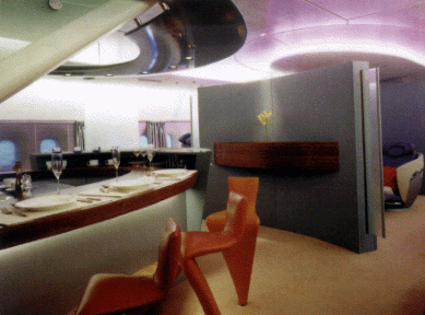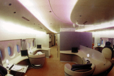 「間もなく気流の乱れているところを航行いたしますので、シートベルトの着用をお願いします。」 さて、みなさんは今どこにいるか分かったかな?ここでこの写真が出てきたのですでに分かったかと思います。そう、これは近未来の飛行機の中なのでした。 この飛行機は、エアバス社の次世代超大型旅客機「A380」だ。総二階建てで座席数は現世界最大であるボーイング747を大きく上回る555席である。 |