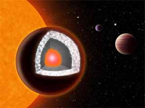 興味をそそる論文が発表された。地球から約40光年の距離にダイヤモンドで出来た惑星が存在する事を、フランスとアメリカの合同研究チームが発表した。 この惑星は、「かに座55番星e」と呼ばれており、大きさは地球の2倍、重さは8倍にも及ぶそうである。 この惑星自体は2011年に発見されていたが、その後詳しい分析を行った結果、この惑星の表面はダイヤモンドで覆われており、惑星全体の3分の1がダイヤモンドで構成されている可能性があるそうで、ダイヤモンドだけで地球3個分と同じ重さになる計算だ。 また、この惑星は恒星の周りを約18時間で公転しており、恒星からの距離もかなり近い事が観測で分かっている。地球での一年が、この惑星ではわずか18時間なのである。 一眠りするだけで半年が経過してしまうとんでもない所である。ちょっと居眠りしてしまったために、スキーシーズンを逃してしまった!という事もありうるのだ(数時間待てばまた同じ季節が訪れるのであるが・・・)。ちなみに、恒星からの距離が異常に近いため、表面付近の気温は2千℃を越えている。当然スキーなど出来る訳も無く、水も蒸発してしまうため夏場の海水浴などもあり得ない状況である。