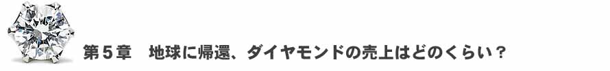 地球に無事帰還し、往復80年をかけた旅をようやく終えた時、既に私の年齢は90歳を越えていた。80年前とは町の景色も様変わりしており、当時の面影はひとつも無くなっていた。 道端に落ちている新聞の記事が目に留まった。「人工ダイヤモンド製造技術完成。安価で大量生産が可能に」という記事だ。いやな予感がした。80年も経てば、ダイヤモンドも簡単に作れる技術が完成していてもおかしくない。ダイヤモンドの相場価格はどうなっているのだろうか。 取ってきたダイヤモンドのひとかけらを、試しに宝石店に持ち込み、鑑定してもらうことにした。安価な人工ダイヤモンドが出回り、値崩れが起きる前に売りさばかなければと思った。 鑑定士はダイヤモンドをルーペ越しに眺め、「おおっ」と声を上げた。「こんなに純度の高いダイヤは初めて見た。まだお持ちであれば、ぜひうちで全量買い取らせていただきたい。最高クラスである極上品と同価格で買い取りたい。」と言って来た。これは予想以上の値がつくと思い、「すぐに全量持ってきます。」と返事をし、早速運送業者の手配をした。 ダイヤモンドというのが知れると強盗に襲われるおそれがあるため、宅配便の伝票の「品名」の欄には「石」と記入し、5000トン分の運送を依頼した。宅配便で扱っている最も大きい荷物サイズ50kg以下を利用すると、5000トン分で10万箱となり、料金は1箱5840円※佐川急便、都内→都内、通常輸送 なので、10万箱で5億8400万円がかかってしまう。借金がどんどん増えていくが、全数売れれば全ての借金は無くなり、利益分でこの先ずっと豪遊が出来る(当人はすでに90歳を過ぎており、老い先は短いが・・・)。 40トン積載の大型トレーラー125台が宝石店にやってきた。宝石店の鑑定士は、「これ全部ダイヤモンドなのか!こんな大量の買取はできない。全国の宝石店を紹介するから、各店舗で買い取ってもらってくれ。」とのことで、各店舗へ送付することにした。10万箱の配送伝票をさらに記入し、遠隔地にも送付することとなるため、配送料金はさらに7億円程がかかり借金はどんどん増えるばかりである。