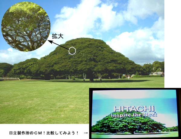 この木、葉っぱがふさふさあるように見えるが、木の下から上を覗くとけっこうスカスカであった。時期的に冬(といっても平均気温は23度くらいであるが)ということで葉っぱが少なくなってしまったのだろうか? 地面の芝はかなり手入れが行き届いており、ゴルフ場としても経営出来るのではないかというほど。ここに来た日は平日ということもあり、人出はまばら。休日の午後にもなると、弁当を持ったカップルや家族連れでにぎわっていることだろう。 |