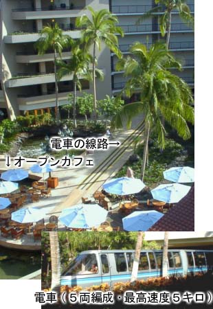 この電車は5両編成。そのうち1両は非冷房車となっており、冷え性の人にも快適に利用できるような心配りが行き届いている。また、電車の最高速度は時速5キロの設定になっており、数多い子供客が急に飛び出してきても安全に停車できるようになっている。約5分間隔のダイヤとなっており、平日昼間の山手線くらいの間隔で電車が来る感じだ。実に便利であった。このホテルの端から端まではかなり距離があり、この電車の存在価値はかなり高い。子供たちにも人気があるらしく、子供連れの客が多かった。 |