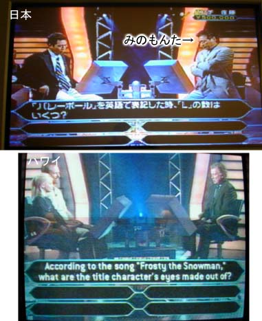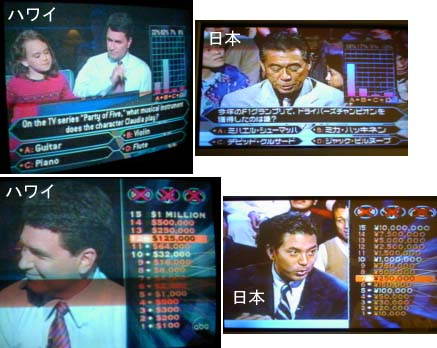 日本ではみのもんたが司会を務めているが、ハワイの番組の司会もみのもんた似のアメリカ人がやっていた。 日本では、進行度合いがかなり遅く、"ファイナルアンサー"のあとから"正解"に行くまでにかなりの間をもたらしている。これで時間を稼いでいるのか?それともスリル感を増幅させているのか?このハワイの番組はあっけないほどテンポ良く進行する。おそらく日本の番組の2倍くらいの問題数をこなしてしまっているのではなかろうか? |