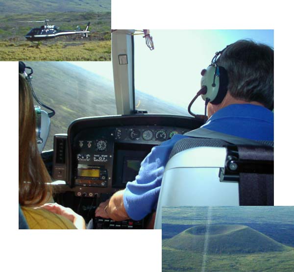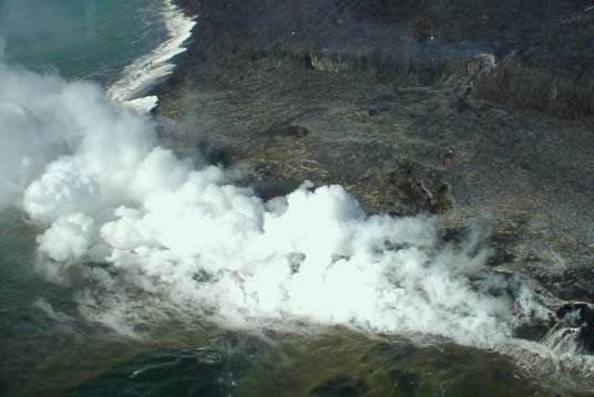 ここは地上からでは近づくことが出来ず、ヘリコプターから見る以外に方法は無いらしい。私たちの乗ったヘリコプターでは、地上約30メートルくらいにまで近付いてくれた。かなりの迫力が味わえた。 よく見ると、煙の隙間から赤く光る物体が一瞬見える。あれが灼熱の溶岩なのか?と感激!真っ赤な生の溶岩をこの肉眼で見ることが出来るとは。 |