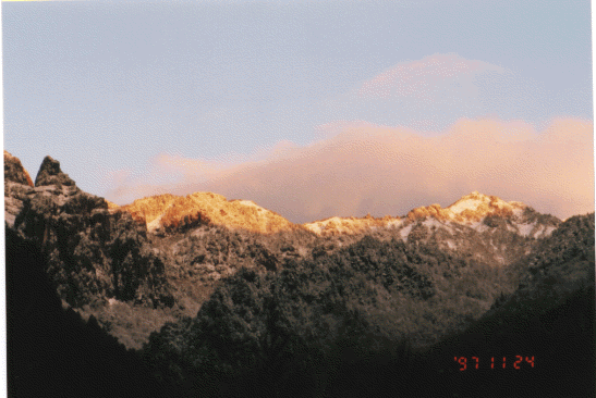 穂高岳山頂が朝焼けの光を浴び