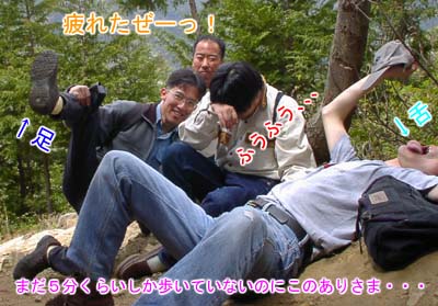 登山口から約10メートル進んだか。まずここで1回目の休憩。すでに疲れが出始める人が。