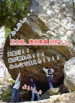 この岩石、大きさから推定するに、優に5000トンはあるであろう。3人で支えるとなると、一人当たり1667トン。通常の人間なら間違いなく押しつぶされることだろう。しかし、火事場の馬鹿力とはよく言ったもので、この時、3人はなんとかこの巨大岩石を押し返し、事なきを得た。