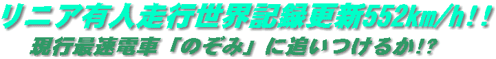 平成11年4月14日、JR東海と鉄道総研が実施したリニアモーターカーの走行試験(5両編成MLX01車両)で、有人走行としても世界記録となる552km/hのスピードを記録した。