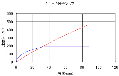 スタートダッシュは完全に自動車のほうが速い。しかし、スピードが上昇してくると、走行抵抗の大きい自動車はスピードが伸びなくなってくる。ここでは、リニアの路上との抵抗ほとんどゼロ(浮上走行のため)、空力特性フォルムが威力を発揮する。