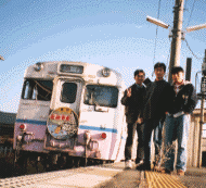 JR岐阜駅停車中の急行たかやま号車内で(写真左)。「高山に向けて出発ーっ!!」 非常にボロいディーゼル車の急行たかやま号(写真右)。車内は排気ガスで充満。どこからか車内に漏れているようだ。 12時50分、高山に定刻どうりに到着。