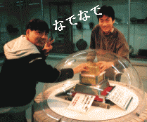 飛騨大鍾乳洞。その中にある大橋コレクション館。 2億円の金塊に触る二人。重さは約100s。一人じゃ盗めないね! |