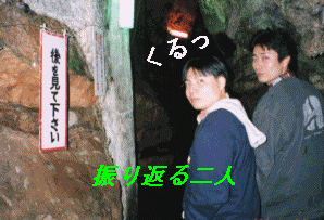 「後を見て下さい」の看板を見て振り返る二人 |