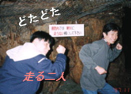 「絶対に走らないで」の看板を見て全力疾走の二人 ※よい子は真似しないでね!! |